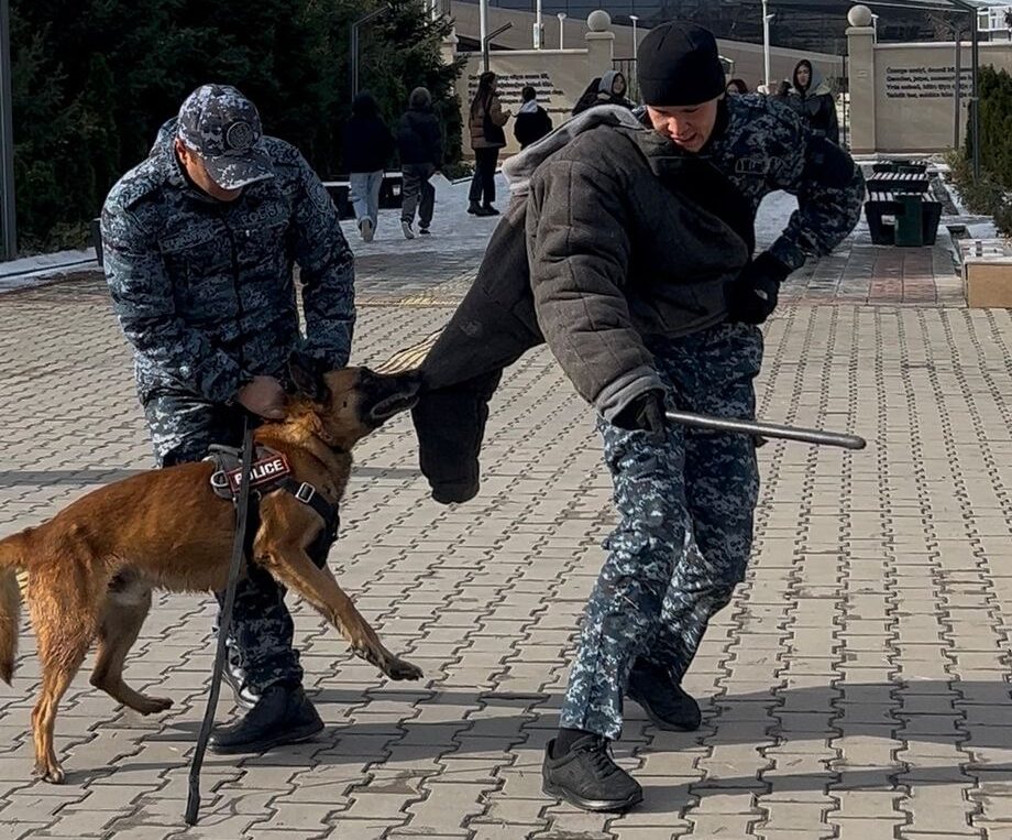 Жетісу облысы Кинология қызметі орталығының аға инспектор-кинологы, полиция капитаны Мақсат Маматжанов жастарға кинология қызметі, қызметтік иттерді дайындау, жаттықтыру және оларды түрлі қылмыстардың ізін ашуда қолдану бағытындағы жұмыстарымен таныстырды. Студенттерге полиция қызметкерлерінің күнделікті еңбегі мен қызметтік иттердің қоғам қауіпсіздігін қамтамасыз етудегі рөлі туралы жан-жақты ақпарат берді. Кездесу соңында қызметтік иттердің із кесу, есірткі заттарын анықтау және қоғамдық тәртіпті сақтау бойынша түсірілген бейнебаян көрсетілді.