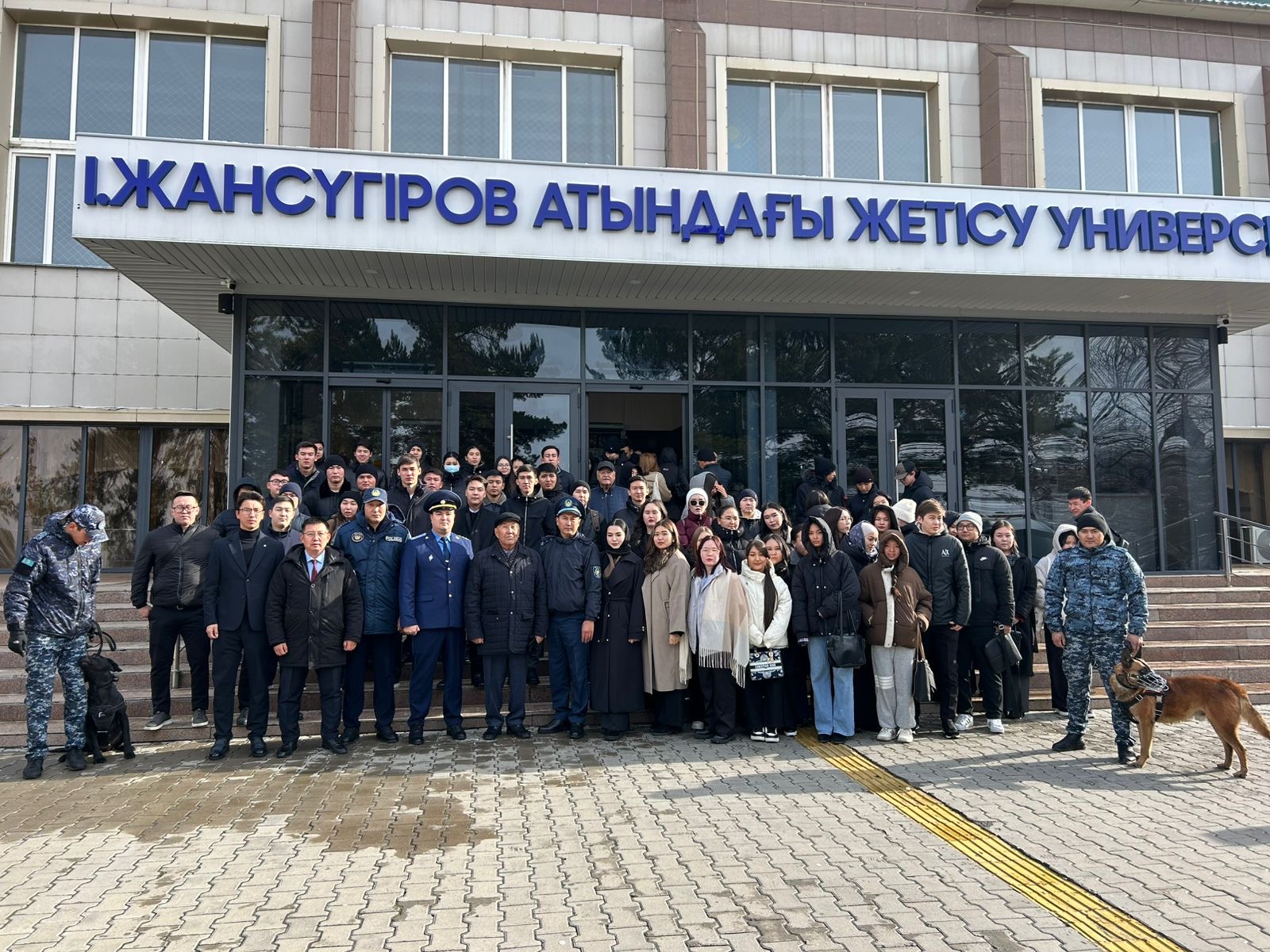 Жетісу облысы Кинология қызметі орталығының аға инспектор-кинологы, полиция капитаны Мақсат Маматжанов жастарға кинология қызметі, қызметтік иттерді дайындау, жаттықтыру және оларды түрлі қылмыстардың ізін ашуда қолдану бағытындағы жұмыстарымен таныстырды. Студенттерге полиция қызметкерлерінің күнделікті еңбегі мен қызметтік иттердің қоғам қауіпсіздігін қамтамасыз етудегі рөлі туралы жан-жақты ақпарат берді. Кездесу соңында қызметтік иттердің із кесу, есірткі заттарын анықтау және қоғамдық тәртіпті сақтау бойынша түсірілген бейнебаян көрсетілді.
